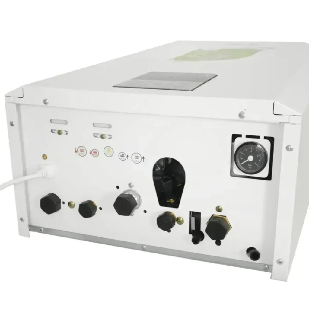 Внутрішнє оснащення включає розширювальний бак об’ємом 8 літрів, вбудований частотний циркуляційний насос і ефективний теплообмінник, що забезпечує стабільну передачу тепла і довговічність роботи системи. Для підключення передбачені стандартні різьбові з’єднання, що спрощує монтаж і інтеграцію в існуючу інженерну мережу.